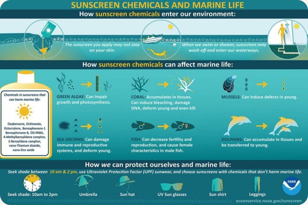 Another study, published in the “December 2013 issue of Ecotoxicology”, took a closer look at Benzophenone-2, also called BP-2, another UV filter commonly used in sunscreen.They found that even at a very low concentration, the chemical can quickly kill juvenile corals, cause colorful corals to bleach, and can potentially induce or increase mutation in corals by causing damage to their DNA. But not only corals are harmed by the stated chemicals, also other parts of marine life are endangered as this graphic from NOAA illustrates: